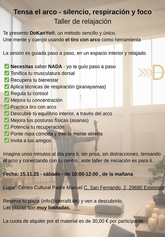 Am Samstag, den 15. November, von 10:00 bis 12:00 Uhr wird im Padre Manuel Kulturzentrum ein Entspannungsworkshop namens DoKanYo stattfinden. Es wird die Balance zwischen Geist und Körper durch Bogenschießen gefördert. DoKanYo ist eine innovative Methode, die mentale Konzentration, bewusstes Atmen und körperliche Bewegung kombiniert und Bogenschießen als Werkzeug für die innere Verbindung nutzt. Es…