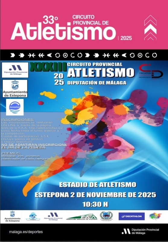 Die Veranstaltung findet am Sonntag, den 2. November, ab 10:30 Uhr statt. Anmeldung bei der Andalusischen Leichtathletikföderation: https://web.faalive.com/inscriptions/94/fares/283 Die Stadtverwaltung von Estepona informiert, dass am 2. November ab 10:30 Uhr im Städtischen Leichtathletikstadion die XXXIII. Ausgabe des Provinzialen Leichtathletikzirkels (Leichtathletiktreffen) Diputación de Málaga 2025 stattfinden wird, mit der Beteiligung von Athleten aus der gesamten Provinz….