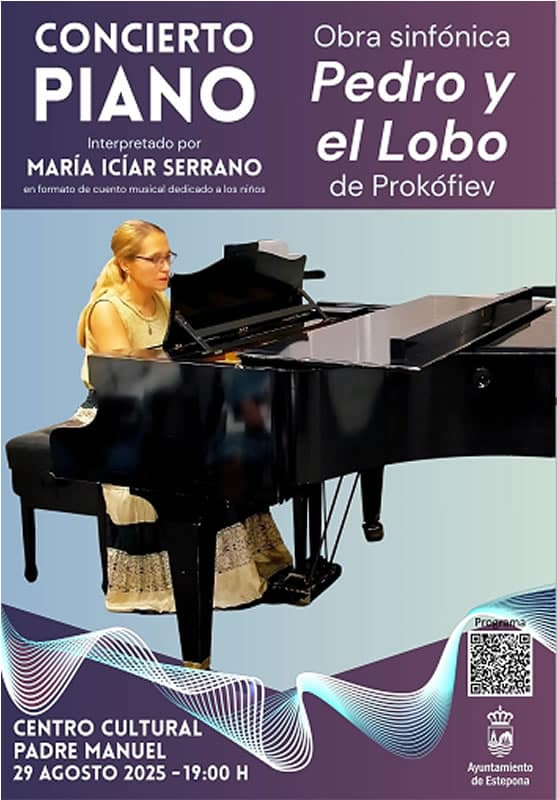 Am Freitag, dem 29. um 19:00 Uhr, mit freiem Eintritt, bis die maximale Kapazität erreicht ist. Die Stadtverwaltung von Estepona informiert, dass die angesehene Pianistin María Icíar Serrano am nächsten Freitag, dem 29. August, um 19:00 Uhr im Kulturzentrum Padre Manuel das sinfonische Werk ‚Peter und der Wolf‘ (Op.67) des russischen Komponisten Sergey Prokofiev (1891-1953)…