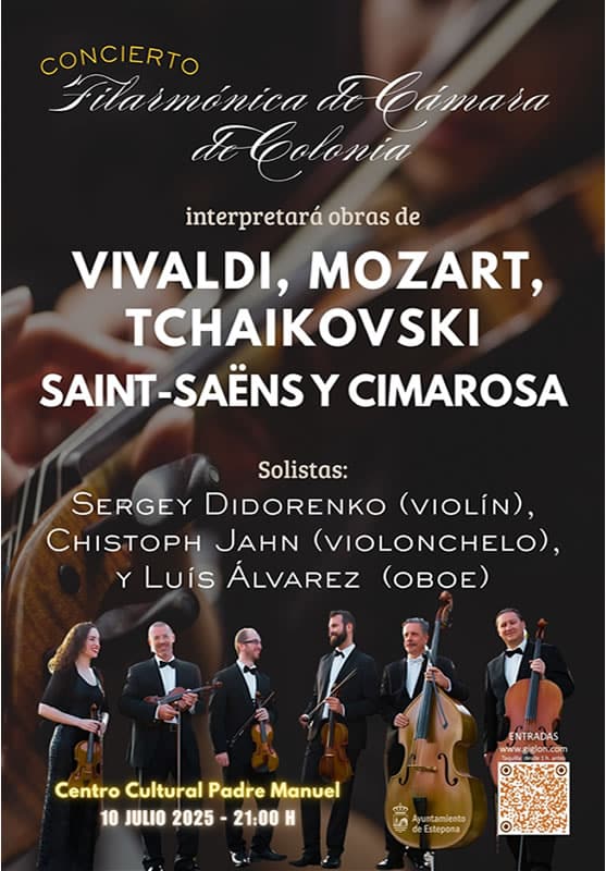 Am Donnerstag, den 10. Juli, um 21:00 Uhr, mit Sergey Didorenko (Violine), Dmitri Gornowskij (Cello) und Luís Álvarez (Oboe). Das Rathaus von Estepona informiert darüber, dass die Kölner Kammerphilharmonie am nächsten Donnerstag, dem 10. Juli, um 21:00 Uhr im Kulturzentrum Padre Manuel auftreten wird. Getreu ihrem erfolgreichen Sommertermin wird die Kammerphilharmonie Köln ausgewählte Werke großer…