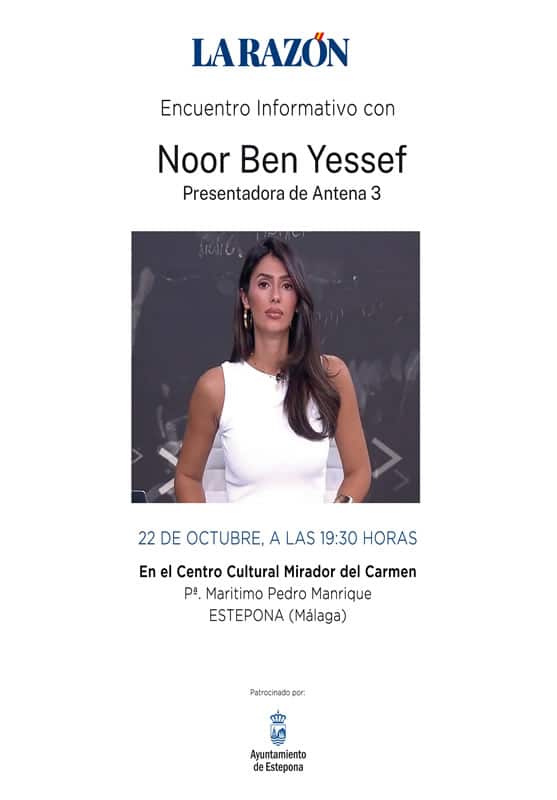 Die Journalistin aus Sevilla wird ein Treffen mit dem andalusischen Delegierten von ‚La Razón‘, Pepe Lugo, ab 19.30 Uhr abhalten. Die Stadtverwaltung von Estepona informiert, dass am kommenden Mittwoch, dem 22. Oktober, die Nachrichtenmoderatorin von Antena 3 Television, Noor Ben Yessef, im Auditorium des Mirador del Carmen einen Vortrag halten wird. Die Veranstaltung, die um…