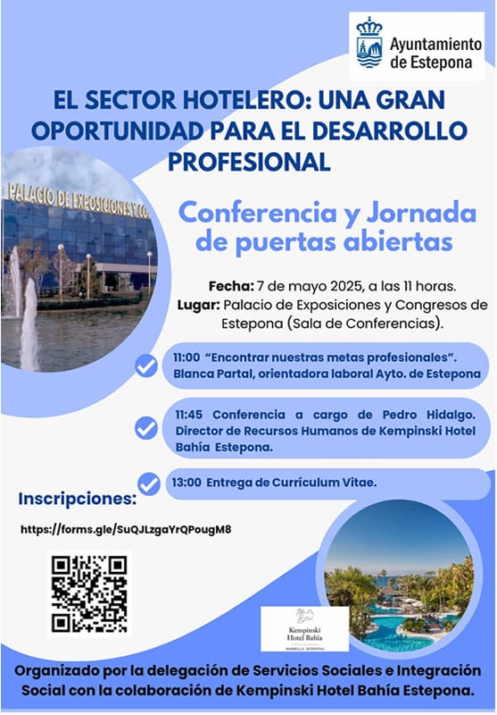 Am Mittwoch, den 7. Mai, im Palacio de Exposiciones y Congresos ab 11 Uhr mit freiem Eintritt, bis die maximale Kapazität erreicht ist. Die Stadtverwaltung von Estepona informiert, dass die städtische Delegation für Sozialdienste und soziale Integration am 7. Mai eine Veranstaltung organisiert hat, die darauf abzielt, die Möglichkeiten für berufliche Entwicklung und Karrierewachstum im…