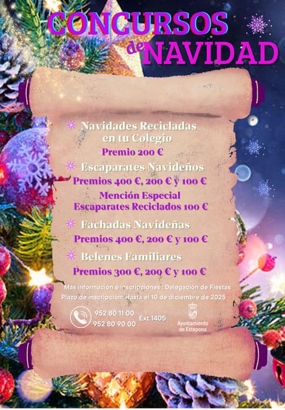 Die Anmeldefrist bleibt bis zum 10. Dezember geöffnet. Der Stadtrat von Estepona informiert, dass die Anmeldefrist für die folgenden Weihnachts-Wettbewerbe 2025 geöffnet ist: Weihnachtsfassaden: Originalität, Dekoration und Beleuchtung werden ausgezeichnet. Die Jury wird am 15. Dezember durch die Straßen ziehen. Preise: 400 €, 200 € und 100 € für die ersten drei Gewinner. Weihnachtsschaufenster: Es…